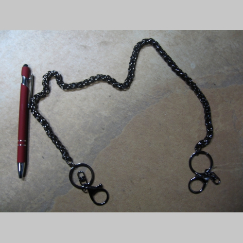 > kovová reťazová kľúčenka na nohavice stredne hrubá, na koncoch s krúžkom a karabínkou dĺžka cca. 65cm farba tmavostrieborná