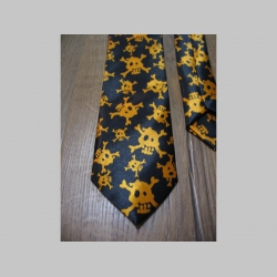 čiernooranžová kravata so vzorom smrtky - lebky - maximálna šírka 8cm minimálna šírka 3cm materiál 100% hodváb
