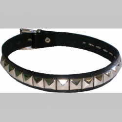 > " obojok " na krk vybíjaný chrómovanými kovovými pyramídkami, 1. radový nastaviteľná veľkosť, zapínanie na kovovú pracku, imitácia kože