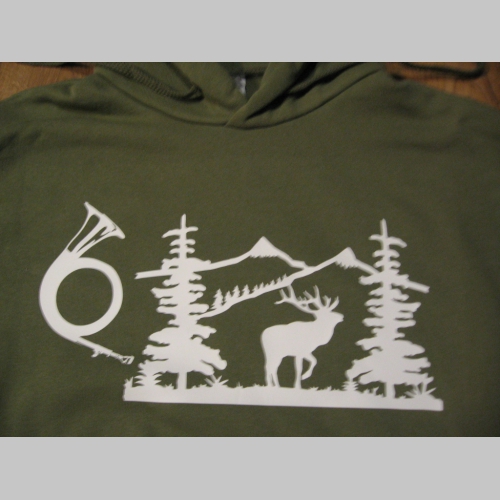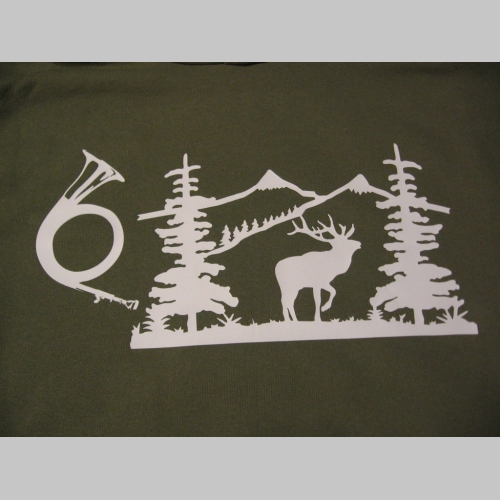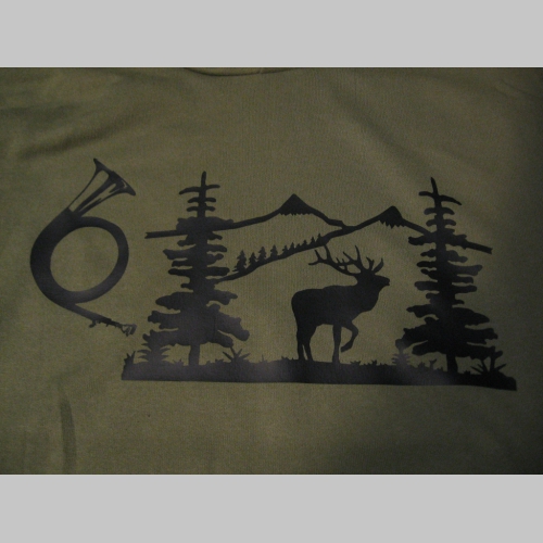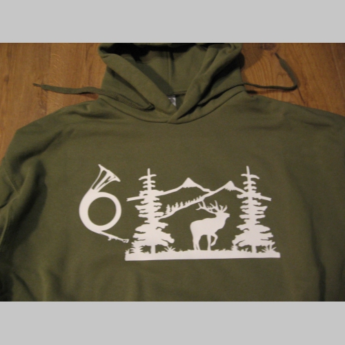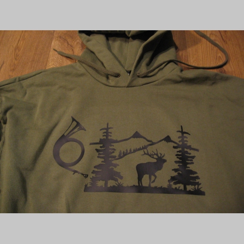 > Polovnícka pánska mikina s kapucou stiahnuteľnou šnúrkami a klokankovým vreckom vpredu, s lesníckym motívom