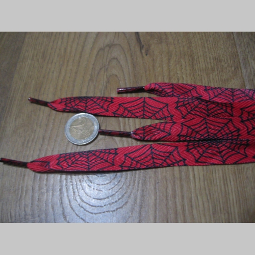ploché širšie šnúrky do topánok farba červená s motívom čiernej pavučiny, dĺžka 110cm šírka 1,9cm materiál:100%polyester