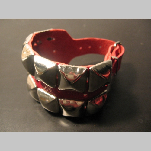 2.radový kožený náramok vybíjaný chrómovanými pyramídkami s rozmerom 1,6x1,6cm (nastaviteľný obvod) celková šírka náramku 4cm