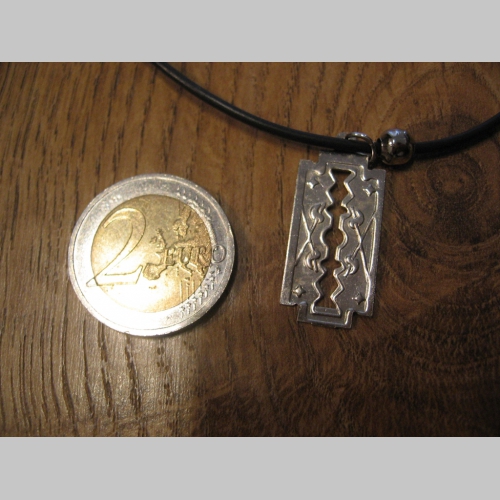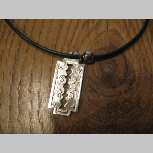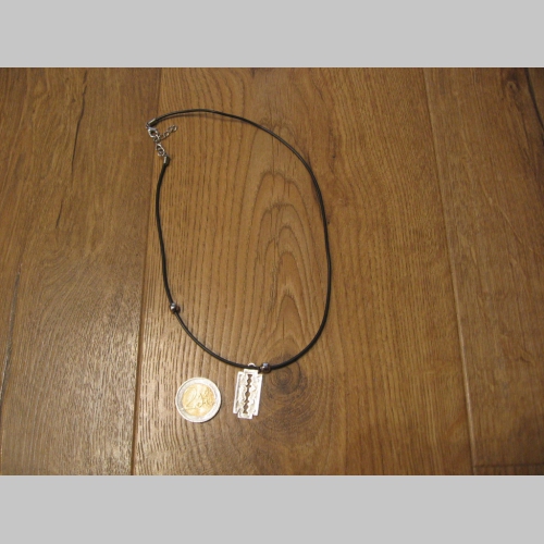 > žiletka - kovový chrómovaný prívesok na krk na plastikovej šnúrke s kovovým zapínaním
