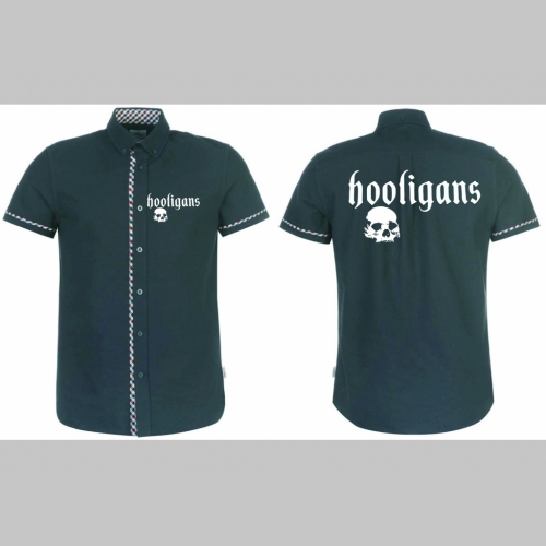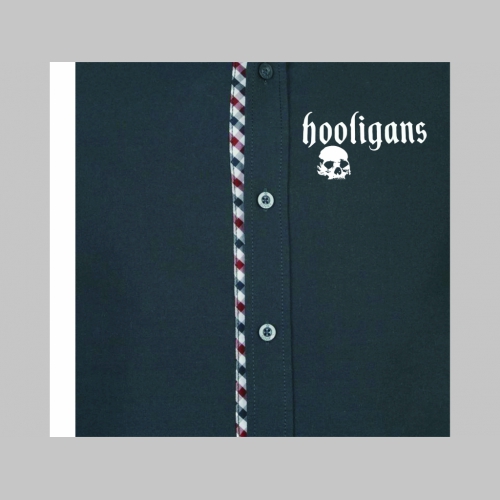 > Hooligans pánska čierna hrubšia košela na gombíky s krátkym rukávom a old school károvanými modrobieločervenými lemami s tlačeným logom 100%bavlna posledné kusy!!!